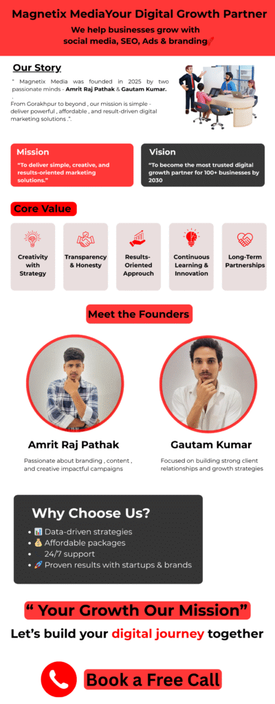 Founded in 2025 by two passionate entrepreneurs β Amrit Raj Pathak and Gautam Kumar β Magnetix Media started with a simple vision: